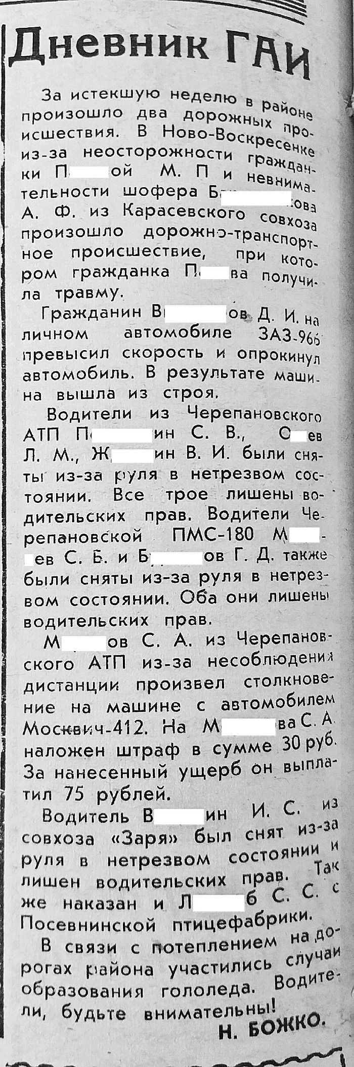 Водитель В-ин И. С. Из совхоза «Заря» был снят из-за руля в нетрезвом состоянии и лишен водительских прав. Так же наказан и Л-б С. С. с Посевнинской птицефабрики.
