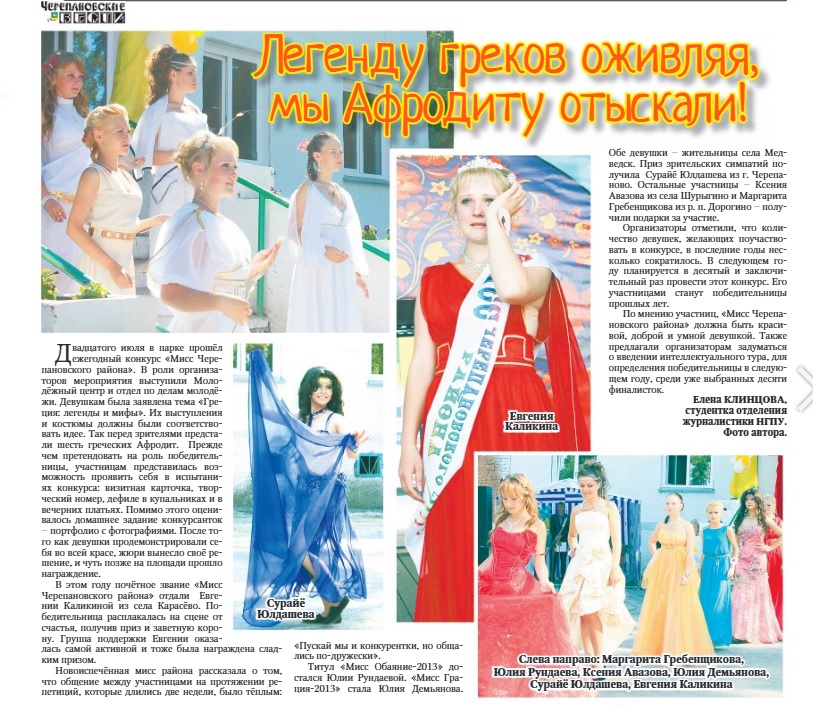 По мнению участниц, «Мисс Черепановского района» должна быть красивой, доброй и умной девушкой. Также предлагали организаторам задуматься о введении интеллектуального тура, для определения победительницы в следующем году, среди уже выбранных десяти финалисток». Елена Клинцова, студентка отделения журналистики НГПУ.