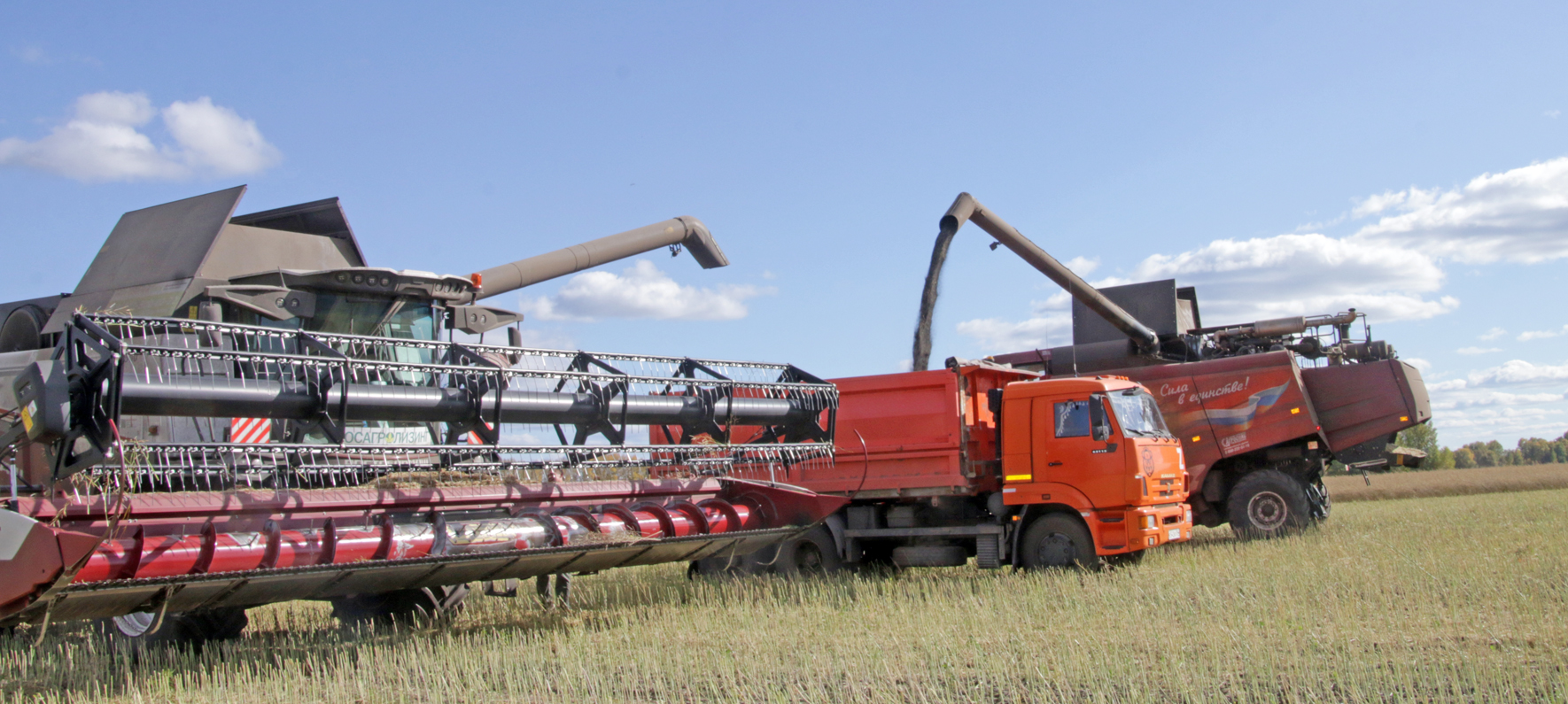 Эта культура даётся непросто. Каждому комбайну нужно сделать не меньше двух кругов, чтобы заполнить свой бункер. А потом несколько минут на разгрузку.