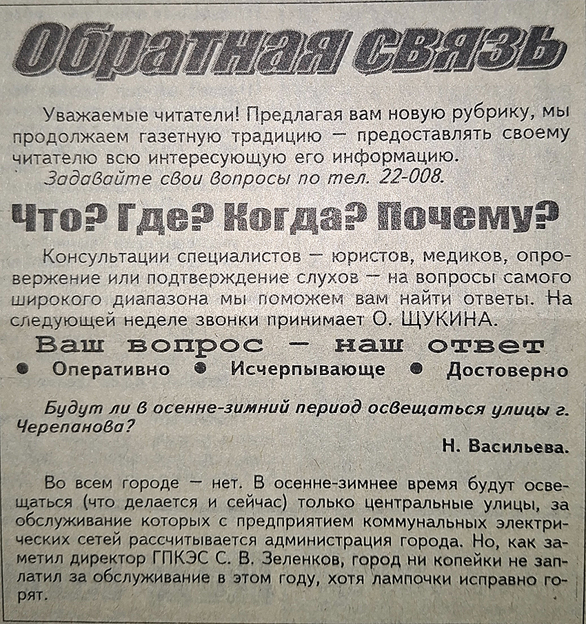 «Уважаемые читатели! Предлагая вам новую рубрику, мы продолжаем газетную традицию – предоставлять своему читателю всю интересующую его информацию. Задавайте свои вопросы по тел. 22-008.