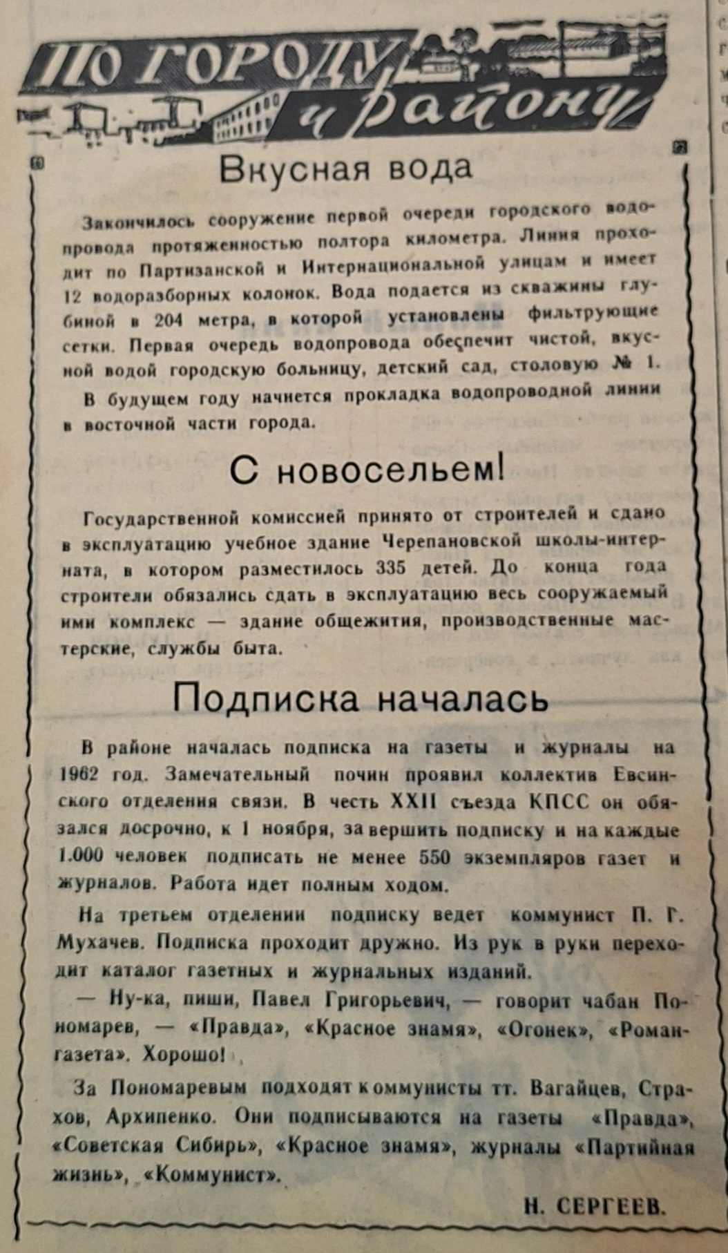В районе началась подписка на газеты и журналы на 1962 год. Замечательный почин проявил коллектив Евсинского отделения связи. В честь ХХII съезда КПСС он обязался досрочно, к 1 ноября, завершить подписку на каждые 1000 человек подписать не менее 550 экземпляров газет и журналов. Работа идёт полным ходом.