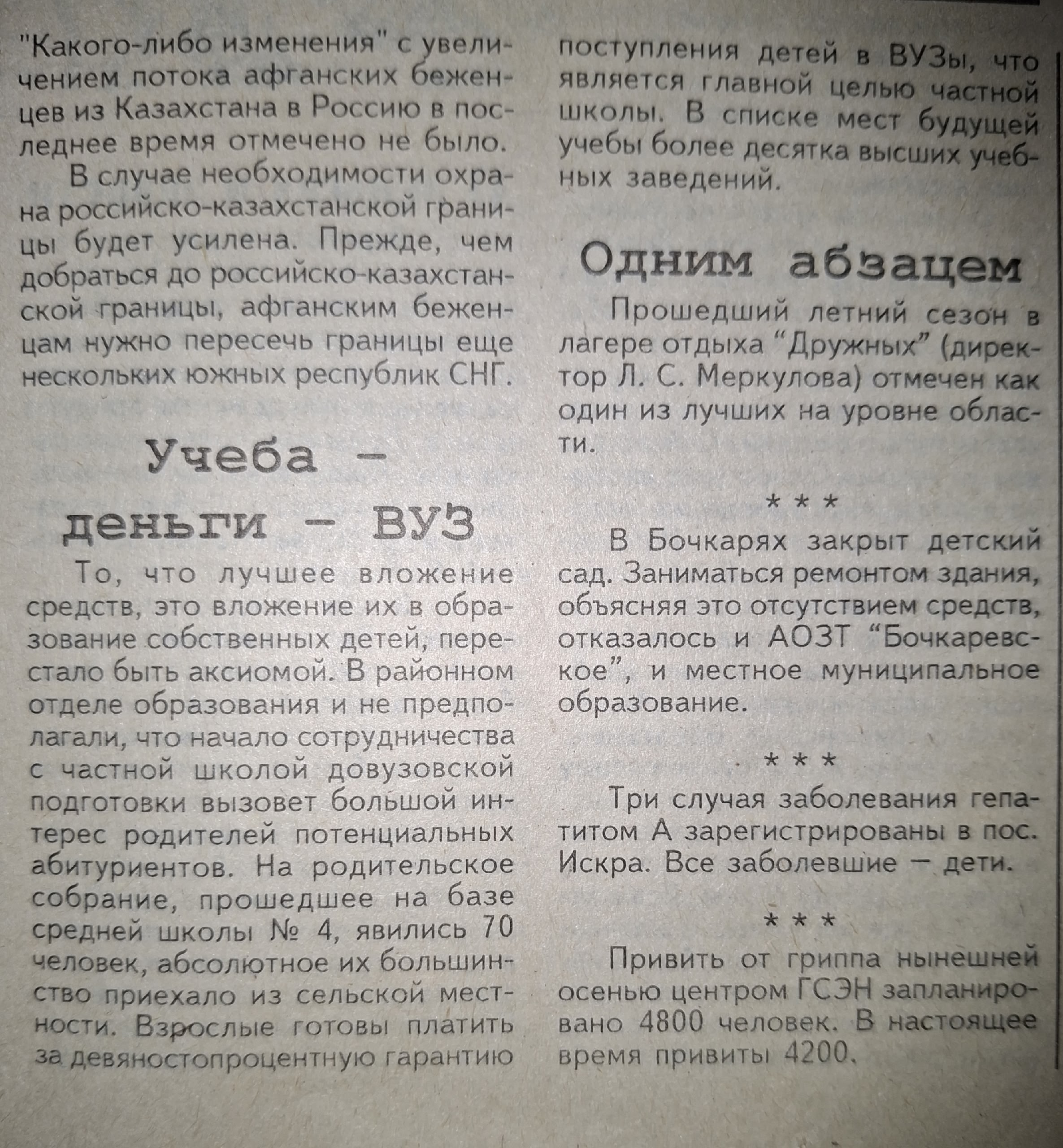 «То, что лучшее вложение средств, это вложение их в образование собственных детей, перестало быть аксиомой. В районном отделе образования и не предполагали, что начало сотрудничества с частной школой довузовской подготовки вызовет большой интерес родителей потенциальных абитуриентов. На родительское собрание, прошедшее на базе средней школы № 4, явились 70 человек, абсолютное их большинство приехало из сельской местности. Взрослые готовы платить за девяностопроцентную гарантию поступления детей в ВУЗы, что является главной целью частной школы. В списке мест будущей учёбы более десятка высших учебных заведений».