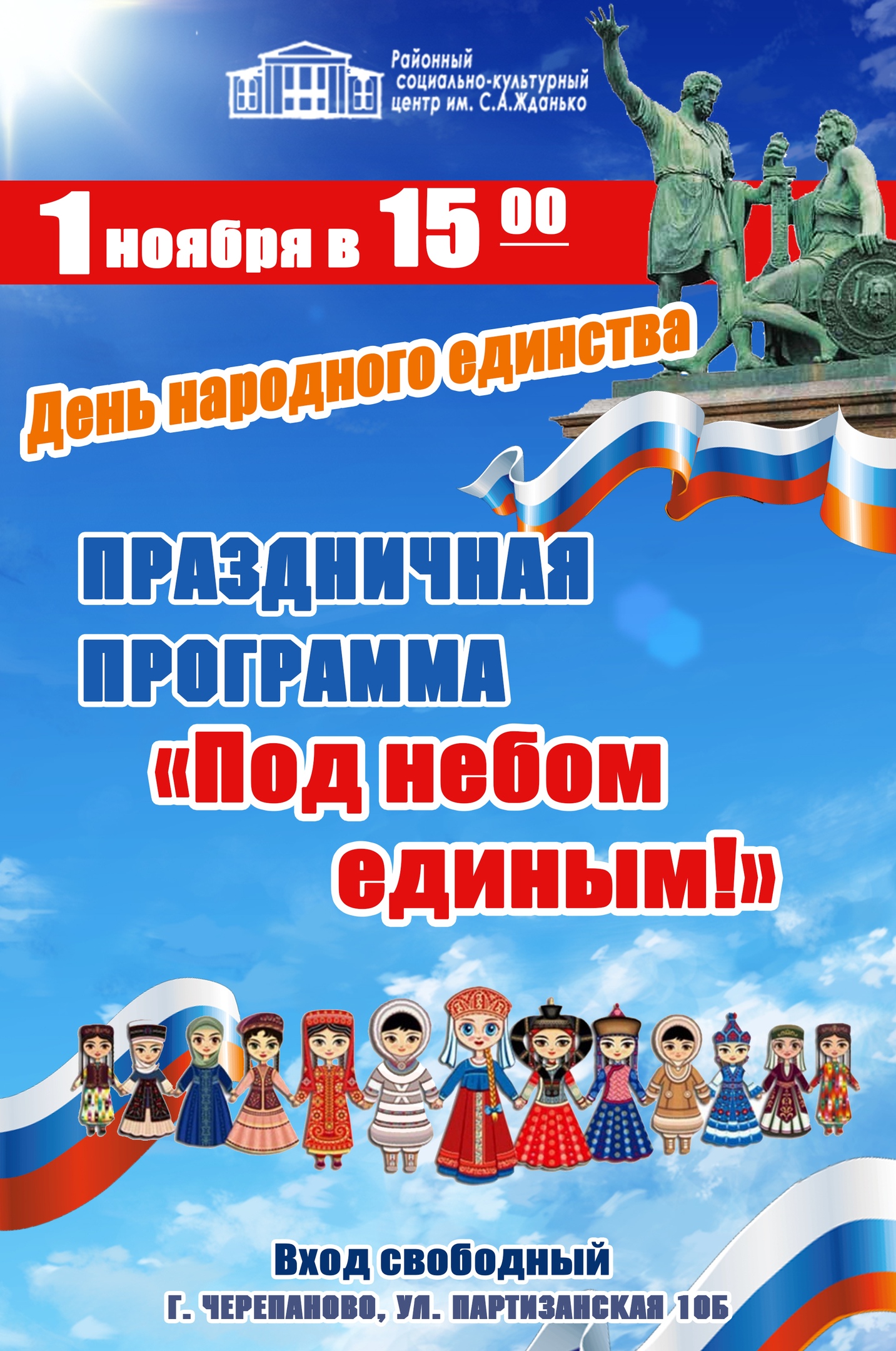 В субботу, 1 ноября, в 15:00 в РСКЦ им. С. А. Жданько пройдёт концерт, посвящённый Дню народного единства. Об этом сообщается в официальной группе социально-культурного центра.