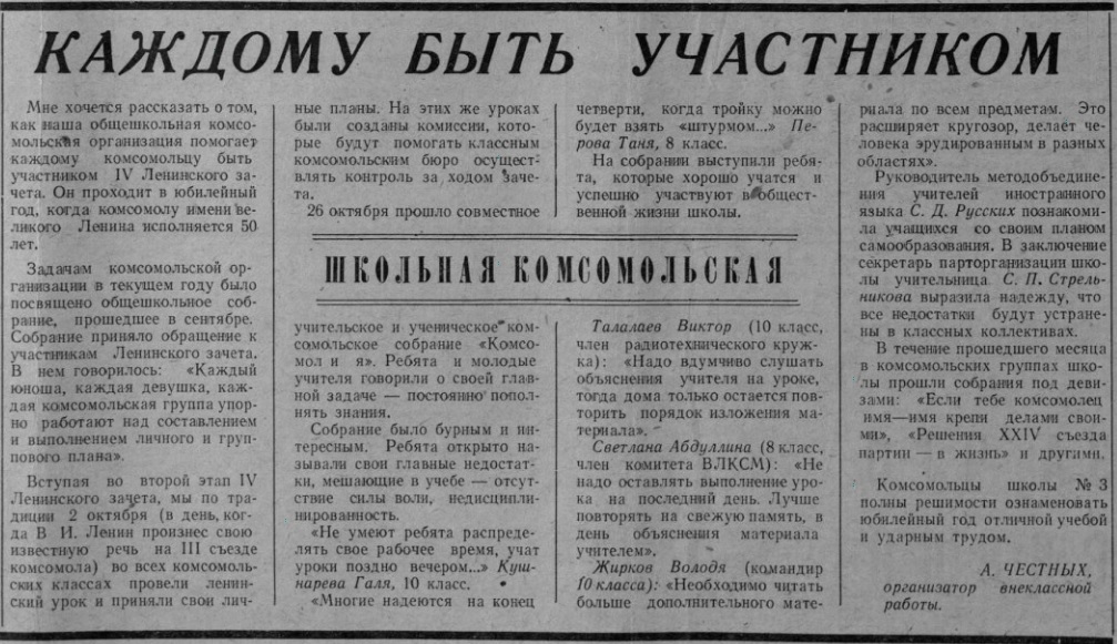 Комсомольцы школы № 3 полны решимости ознаменовать юбилейный год отличной учёбой и ударным трудом». А. Честных, организатор внеклассной работы.