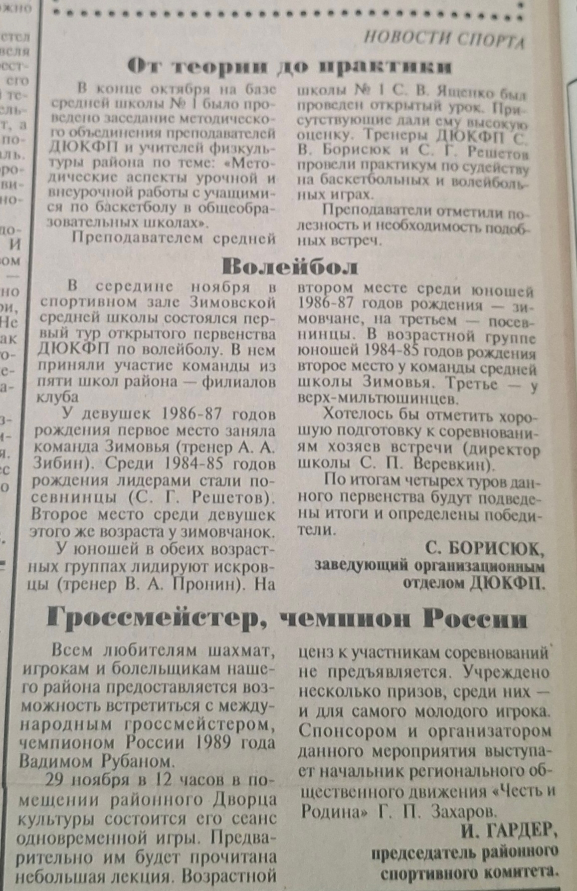 29 ноября в 12 часов в помещении районного Дворца культуры состоится его сеанс одновременной игры. Предварительно им будет прочитана небольшая лекция. Возрастной ценз к участникам соревнований не предъявляется. Учреждено несколько призов, среди них – и для самого молодого игрока. Спонсором и организатором данного мероприятия выступает начальник регионального общественного движения «Честь и Родина» Г. П. Захаров». И. Гардер, председатель районного спортивного комитета.