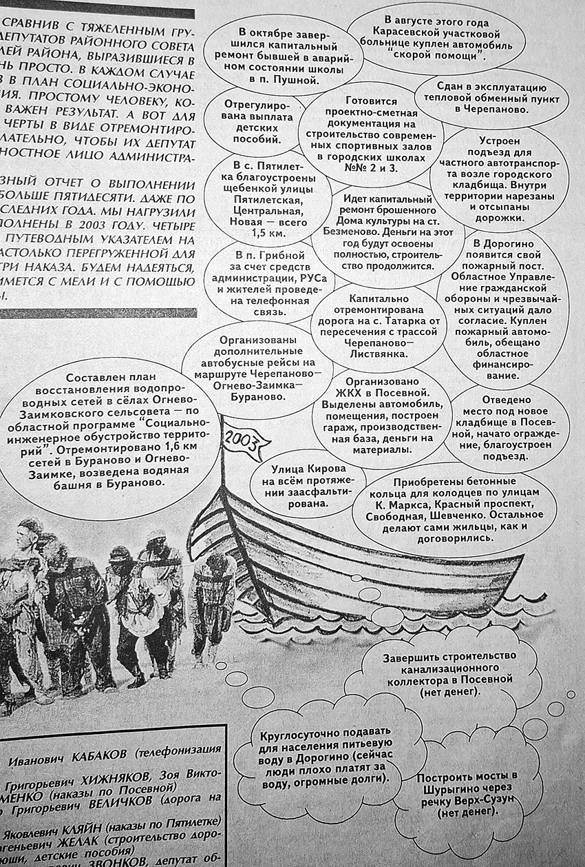 Сегодня мы представляем вам такой вот своеобразный отчёт о выполнении наказов, данных депутатам на нынешний созыв, – их больше пятидесяти. Даже по рисунку видно, что большинство исполнено за три последних года. Мы нагрузили лодку не всеми из них, а в основном, теми, что выполнены в 2003 году. Четыре наказа не удалось полностью выполнить, они стали путеводным указателем на следующий, 2004 год. К сожалению, лодка оказалась настолько перегруженной для наших «бурлаков», что пришлось оставить за бортом три наказа. Будем надеяться, их ещё подберут, когда наш «корабль» окончательно снимется с мели и с помощью человеческой тягловой силы достигнет большой воды».