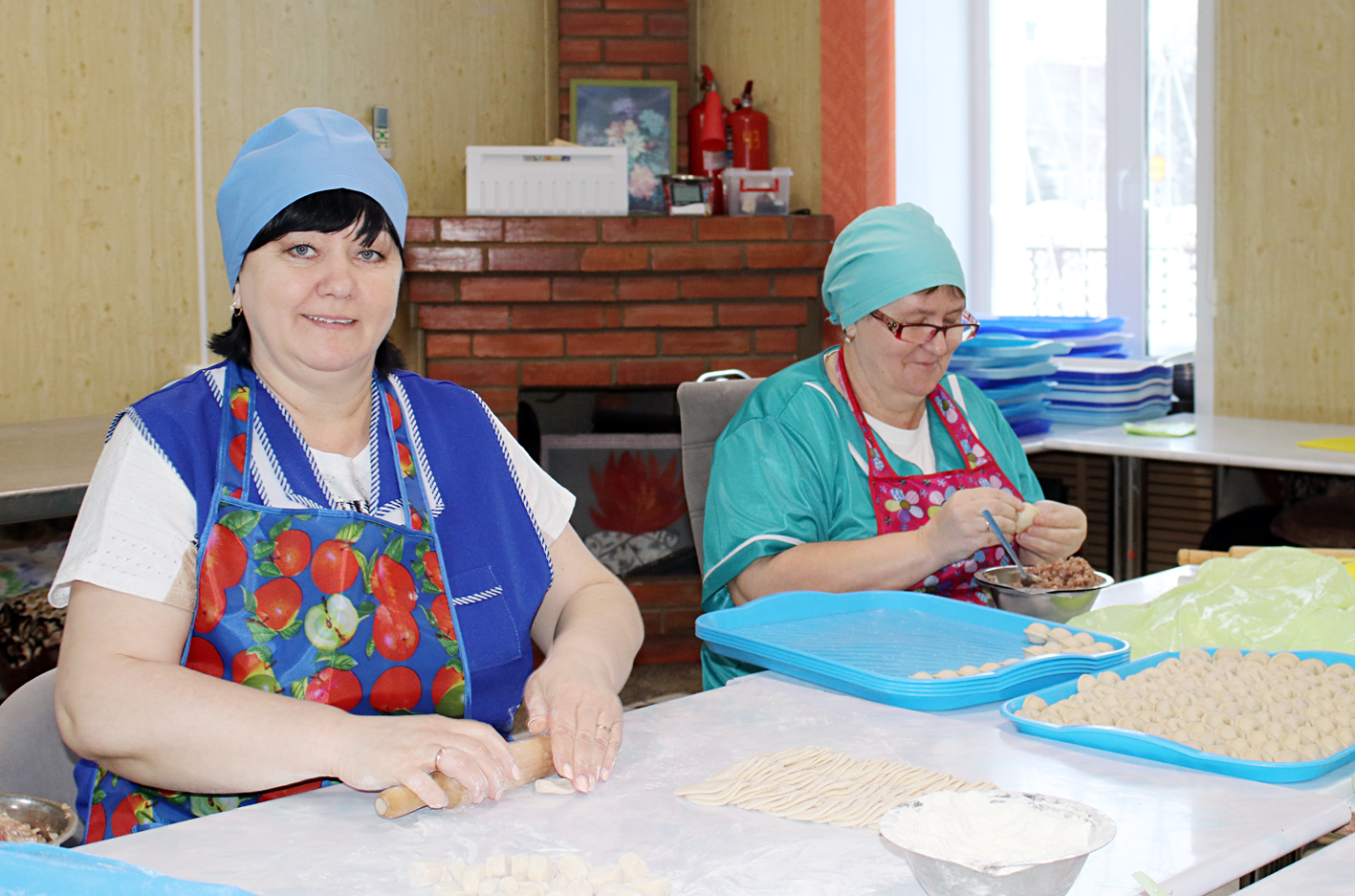 В просторном светлом зале расставлены столы с современным гигиеничным порытием. У каждой лепщицы под рукой всё необходимое, чтобы не отвлекаться: кусочек теста, скалка, небольшая мисочка с фаршем, который маленькими порциями достают из холодильника: нечего ему долго находиться в тепле. Раскатанные сочни лепщица достаёт из-под салфетки, чтобы не подсыхали. Работа, конечно, сидячая, поэтому никакой спешки не заметно, хотя пальчики так и мелькают, и поднос наполняется готовыми пельмешками, как в ускоренной киносъёмке.