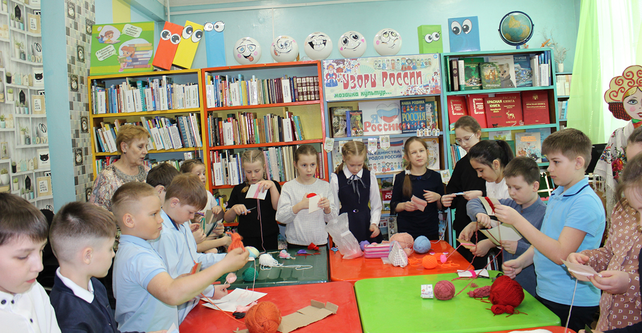 Главным событием недели стал мастер-класс «Нити единства». В библиотеку пришли ученики 2 «В» и 2 «Б» классов школы № 3 (классные руководители М. Н. Тихонова и Н. В. Леус). Сначала говорили о важном: что объединяет разные народы, и почему мир становится ярче, когда мы уважаем особенности друг друга. Дети рассуждали о дружбе, о том, как здорово, что мы все такие разные, но живём на одной территории и можем помогать друг другу.